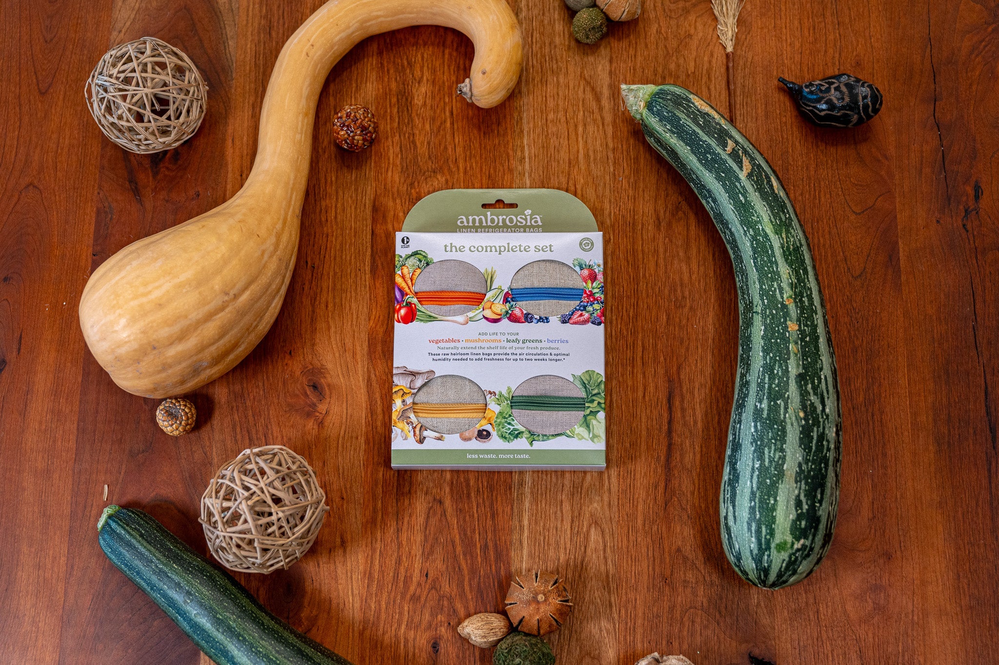 The Complete Set includes all four Ambrosia Bags, each one designed for a specific type of produce. From leafy greens to mushrooms, they help your food stay fresh for longer while replacing disposable storage and supporting a more mindful fridge routine.