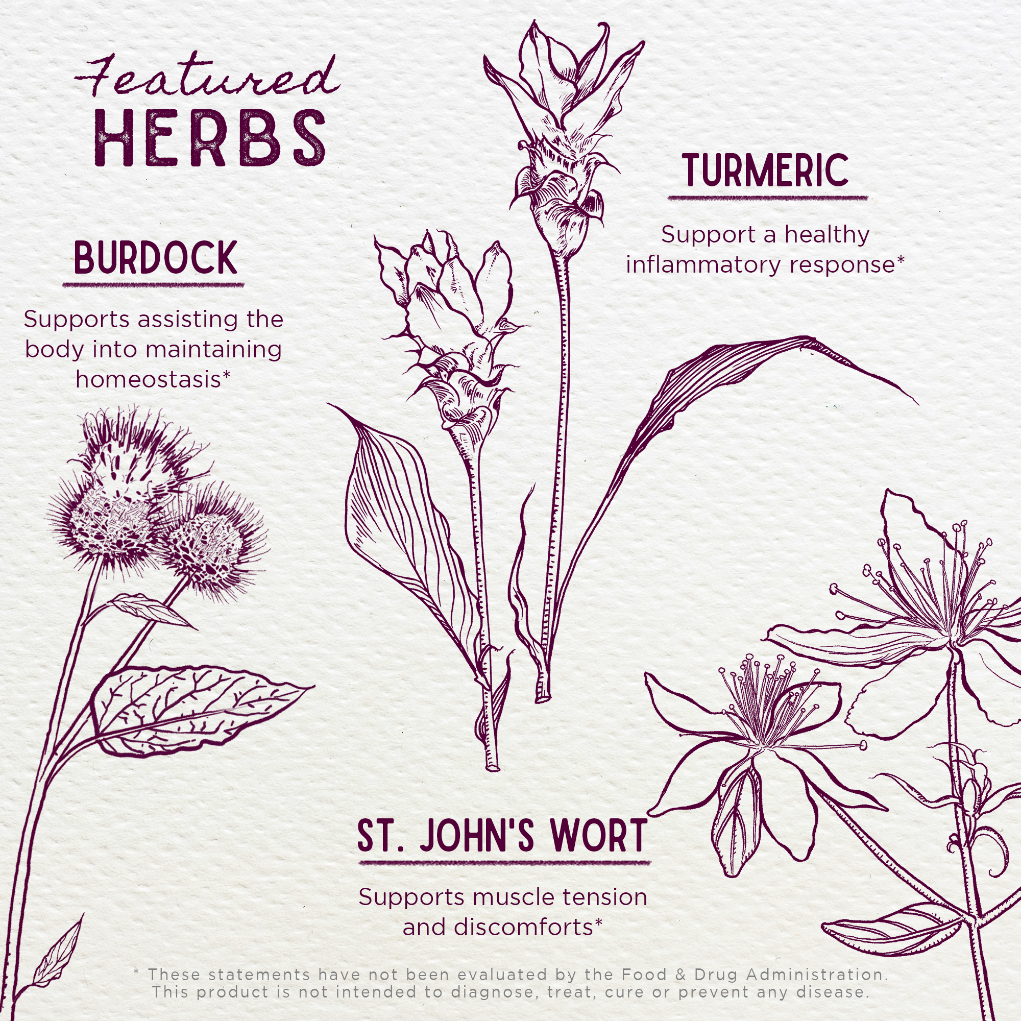 - Burdock root: Arctium lappa is a powerhouse of nutrients that acts as a free radical scavenger, helping to support the body's natural balance and homeostasis. Burdock may help support the body's natural cleansing processes and waste elimination.