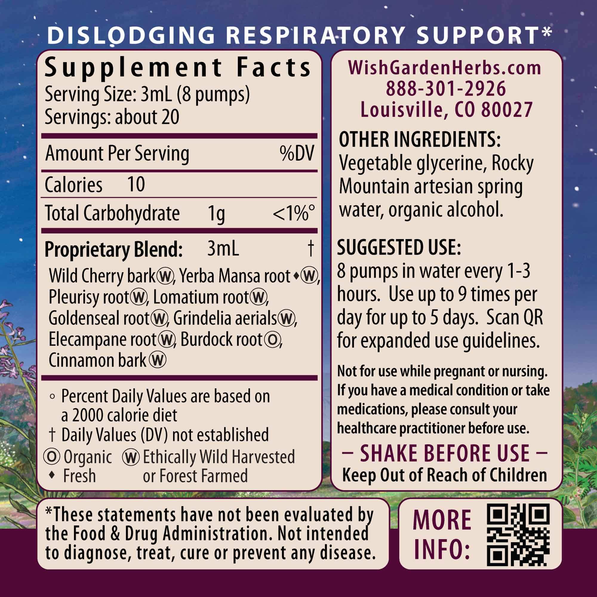 Wild Cherry bark (Prunus serotina), Yerba Mansa root (Anemopsis californica), Pleurisy root (Asclepias tuberosa), Lomatium root (Lomatium dissectum), Goldenseal root (Hydrastis canadensis), Grindelia aerials (Grindelia robusta, G. squarrosa, G. camporum), Elecampane root (Inula helenium), organic Burdock root (Arctium lappa), Cinnamon bark (Cinnamomum bumanii, C. cassia), vegetable glycerine, Rocky Mountain artesian spring water & organic gluten-free alcohol.