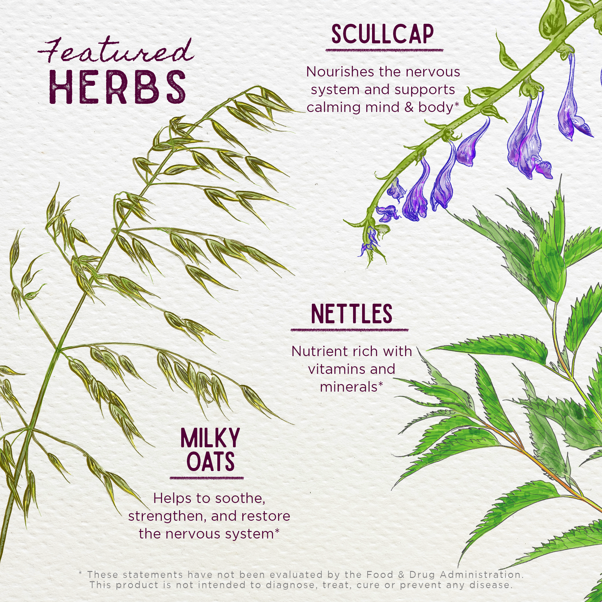 - Milky Oat tops: Avena sativa is the seed of common oats in the green stage, rich in minerals and trace nutrients including magnesium, iron, calcium, B vitamins, and vitamins A and C. It acts as a nutritive tonic that deeply nourishes and strengthens the nervous system, particularly when overworked from mental, emotional, and physical exhaustion. Experienced herbalists consider it one of the best remedies for nervous system weakness, exhaustion, and restoring the body's vitality after prolonged stress.