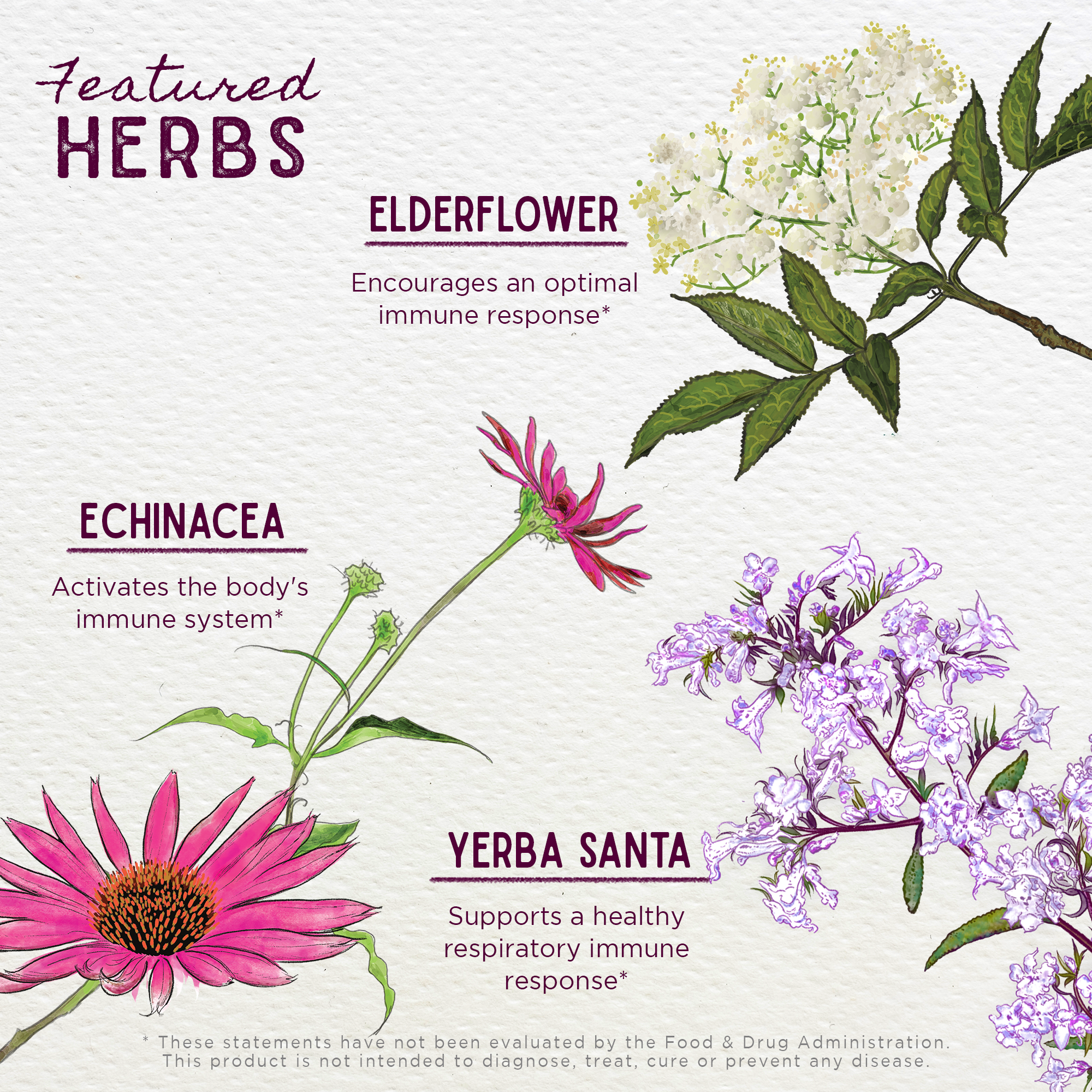 - Elderflower: Sambucus nigra is native to Europe and now naturalized in parts of the United States. This light and delicate herb with honey-scented flowers makes it suitable for kids and adults alike. Elderflower supports the body's natural ability to eliminate waste and encourage a healthy microbial balance and immune response. It may also help support healthy body temperature, soothes sinuses, and supports a healthy inflammatory response in the sinuses during seasonal changes.