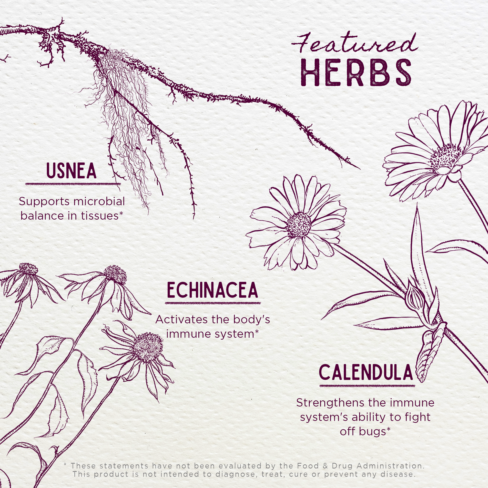 - Echinacea Purpurea root: Native to areas east of the Rocky Mountains in the US, Echinacea purpurea supports the body's natural immune response and immune system wellness. Echinacea provides seasonal immune support and supports a healthy histamine response, promoting comfort during seasonal changes.