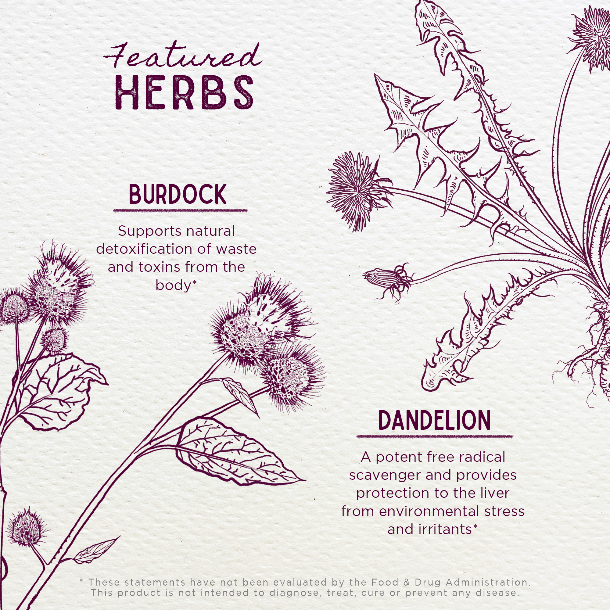 Organic Burdock root (Arctium lappa), organic Milk Thistle seed (Silybum marianum), organic Yellow Dock root (Rumex crispus), organic Dandelion root (Taraxacum officinale), Rocky Mountain artesian spring water, organic gluten-free alcohol & vegetable glycerine.