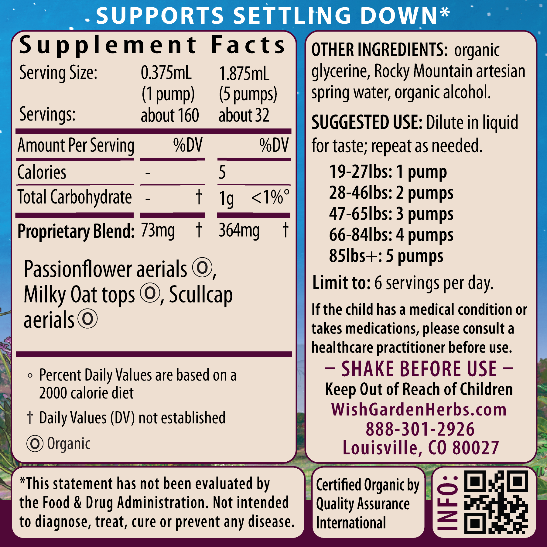 Organic Passionflower aerials (Passiflora incarnata), organic Milky Oat tops (Avena sativa), organic Scullcap aerials (Scutellaria lateriflora), Rocky Mountain artesian spring water, vegetable glycerine & organic gluten-free alcohol.