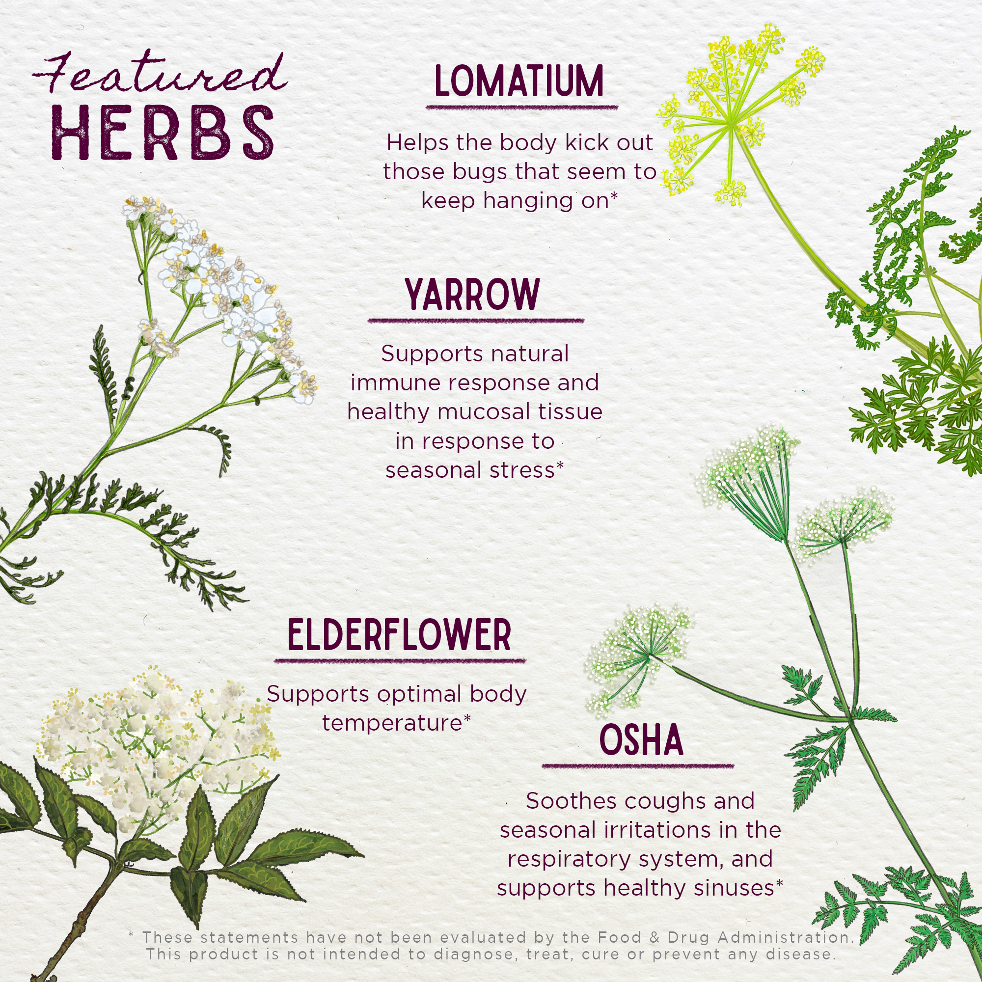 - Lomatium root: Lomatium dissectum is a resinous root that supports immune system strength and helps the body maintain healthy microbial balance during seasonal challenges.